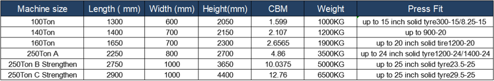 Solid Tire press machine for solid tire mounting use.hydrostatic pressure to assemble and disassemble wheels,three different types of tire press machine according to the application scenario: Rapid Tire Press Machine,General Used Tire Press Machine,Economical and Practical Tire Press Machine.